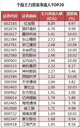 个股来看,今日有2129只个股获主力资金净流入,其中,37股获主力资金净流入超1亿元。红宝丽(002165)主力资金净流入最多,净流入金额为8.09亿元;主力资金净流入居前的个股还有国轩高科、露笑科技、东山精密(002384)、浙江建投、永安药业(002365)等,净流入金额分别为6.76亿元、5.41亿元、2.72亿元、2.68亿元、2.55亿元。