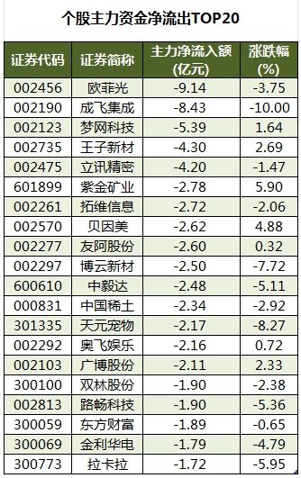 今日有2993只个股被主力资金净卖出,其中,69股被主力资金净卖出超1亿元。主力资金净流出最多的个股是欧菲光(002456),净流出金额为9.14亿元;主力资金净流出居前的个股还有成飞集成、梦网科技、王子新材(002735)、立讯精密(002475)、紫金矿业(601899)等,净流出金额分别为8.43亿元、5.39亿元、4.3亿元、4.2亿元、2.78亿元。