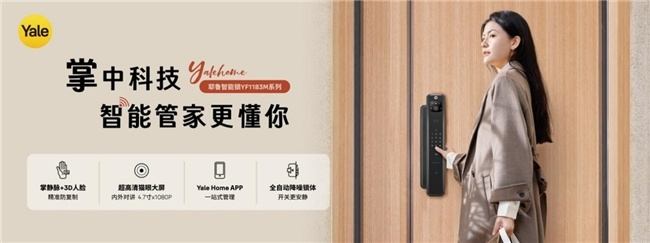 2025年,耶鲁持续打造多元产品矩阵,推动产品不断升级,为新一代租住人群带来更高标准的智慧安防体验。其中,荣获中国家电行业磐石奖“新质引领奖”的Yale耶鲁智能锁YF1153M融合“掌静脉+人脸识别”双重科技识别技术,用实力彰显耶鲁的“磐石”品质和创新力;此外,全新推出Yale耶鲁智能锁YF1183M,集成掌静脉识别、3D人脸识别等七大开锁方式,全面覆盖多样化使用需求;并搭载Yale Home APP,用户可实现远程门锁管理、门外动态实时查看、一键视频通话与远程开锁等智能功能。借助Yale Home App,耶鲁将智能门锁与智慧场景深度融合,不断拓展智能安防的边界,让新世代用户智能家居生活拥有更多安全、更多从容。