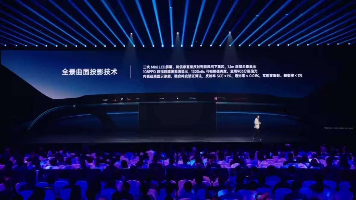 该车具备全景曲面投影技术,三块Mini LED屏幕,将信息直接反射到前风挡下黑区,1.1m 超宽全景显示108PPD超视网膜级高清显示,1200nits可视峰值亮度,全局903分区控光。内嵌超黑显示涂层,融合畸变矫正算法,反射率SCE