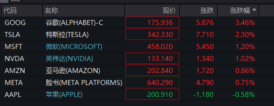 科技七巨头中,目前仅苹果微跌近0.6%,其余科技巨头均上涨,谷歌大涨超3%。