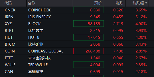 受加密货币大涨消息刺激,相关概念股普涨,截至发稿,COINCHECK涨超8%,IRIS ENERGY涨超5%,BLOCK涨超4%,比特数字、比特矿业涨超3%。