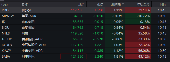 热门中概股中,小鹏汽车跌超6%,BOSS直聘跌超4%;亚朵涨超10%,禾赛科技大涨超7%,微博大涨超6%,名创优品涨超4%。中概科技龙头股中,截至发稿仅拼多多上涨,涨幅超过1%,阿里巴巴、比亚迪(002594)股份ADR、小米集团ADR跌超1%。