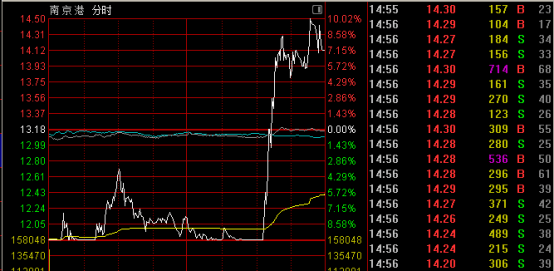 南京港(002040)22日开盘即跌停,随后开板,午后快速拉升,一度触及涨停,再次上演“地天板”走势。截至收盘,该股涨7.2%,全日成交超16.5亿元。
