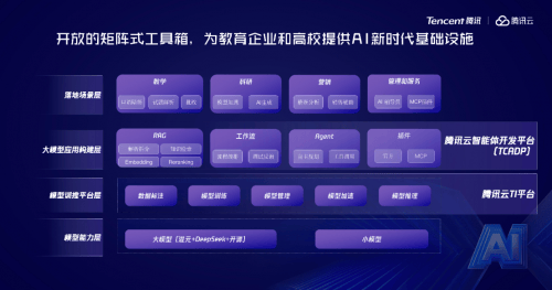 腾讯不断升级AI产品体系,面向教育领域提供人工智能教育(AI Education)、智慧教育(AI for Education)、科研计算(AI for Science) 场景化方案。在当天的2025腾讯云AI产业应用峰会上,腾讯公布大模型矩阵产品全面升级,包含自研的混元大模型、AI云基础设施,智能体开发工具、知识库以及面向场景的应用,以“好用的AI”助力行业加速创新升级。