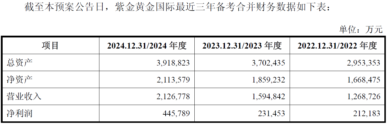 紫金矿业公告显示,截至2024年底,紫金黄金国际的净资产约211亿元。2024年,紫金黄金国际实现营业收入约212.7亿元,净利润约44.6亿元。