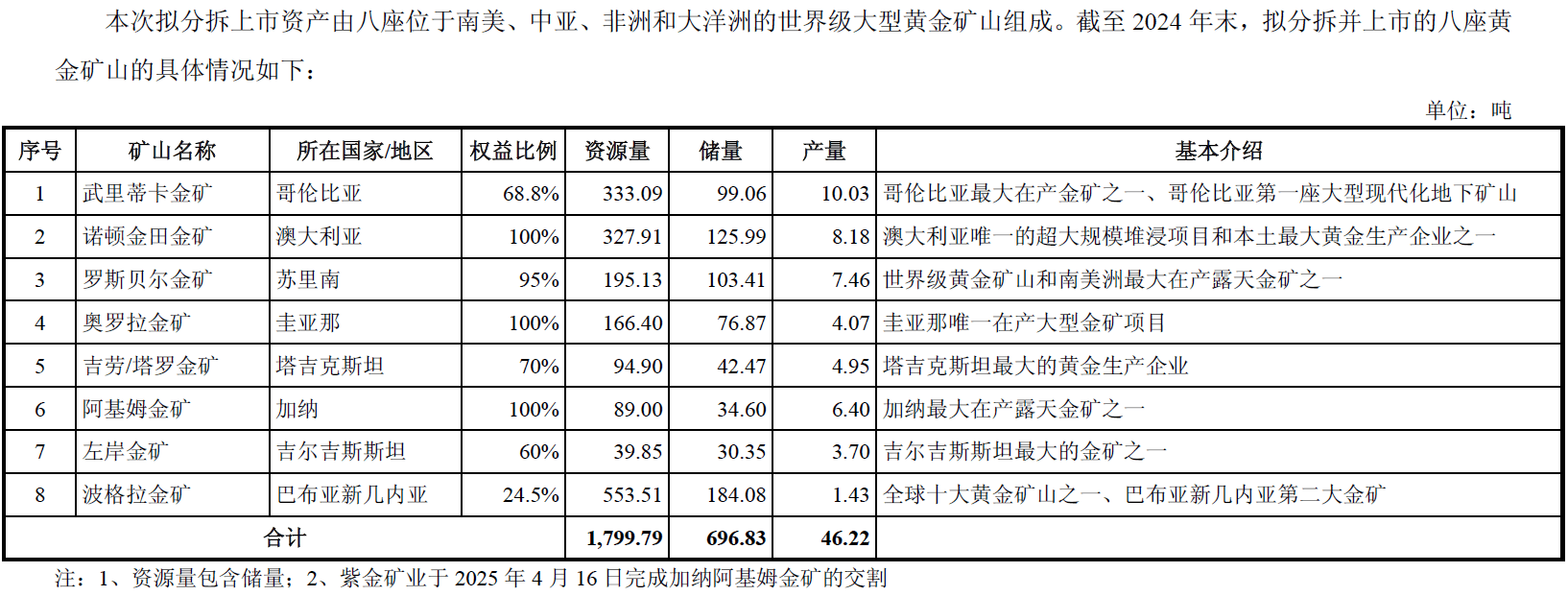 据紫金矿业公告,本次拟分拆上市资产由八座位于南美、中亚、非洲和大洋洲的世界级大型黄金矿山组成,具体包括武里蒂卡金矿、诺顿金田金矿、罗斯贝尔金矿、奥罗拉金矿、吉劳/塔罗金矿、阿基姆金矿、左岸金矿和波格拉金矿。
