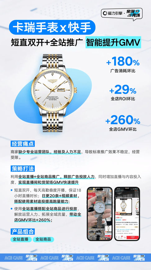 在人力有限的情况下,如何达成稳定的投放ROI,带来生意的进阶突破?卡瑞手表选择借助全站推广,释放广告投放人力。
