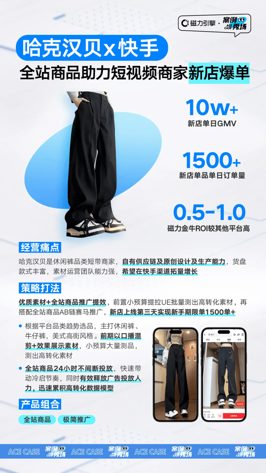 哈克汉贝是新入局快手的休闲裤品类短带商家,凭借自有供应链及原创设计与生产能力,其货盘稳定且款式丰富,素材运营团队能力强,希望抓住换季的机会在快手渠道进行拓量增长。