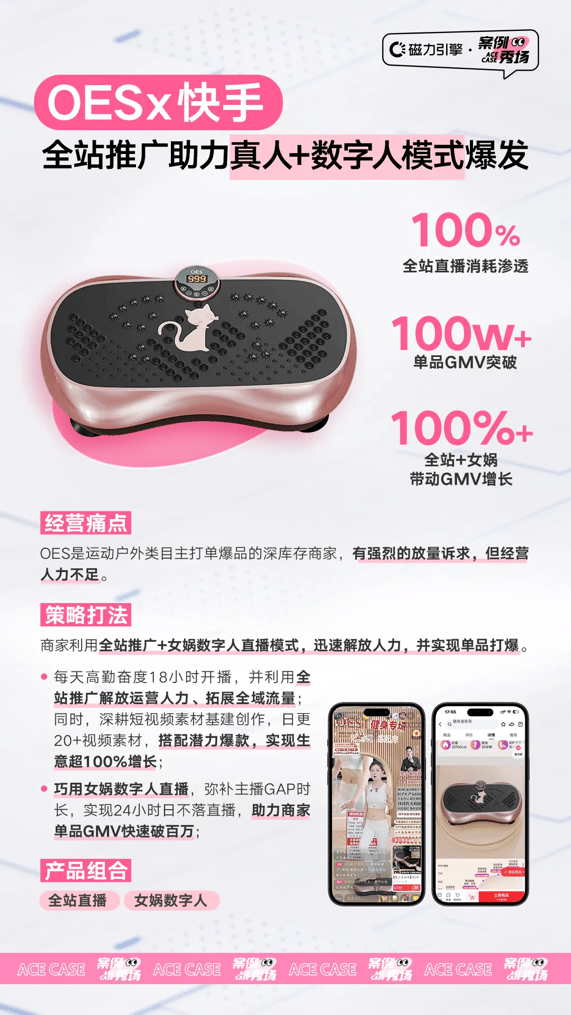 面对这一挑战,OES开始布局全站直播,每天保持18小时开播。同时,再利用女娲数字人直播填补18小时后的流量空窗,打造“真人+AI”无缝衔接的日不落直播间。解放直播人力后,品牌得以攻坚短视频素材基建――日更20条短视频精准狙击用户痛点,高潜爆品素材反复触达目标人群。而这套产品组合打法也让OES全站直播消耗渗透率达到100%,单品GMV破百万,GMV增长超100%。