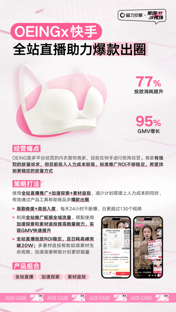 面对这一僵局,OEING选择将“人力杠杆”交给平台工具:通过全站直播拓展全域流量的同时,搭配加速探索、素材追投提高跑量能力,不仅实现全站直播投放ROI稳定,日耗高峰突破20W,更有多款商品借势打爆出圈,实现“人力减负、爆款加码”的破局。在磁力金牛提效下,其店铺投放消耗提升77%,GMV增长95%。