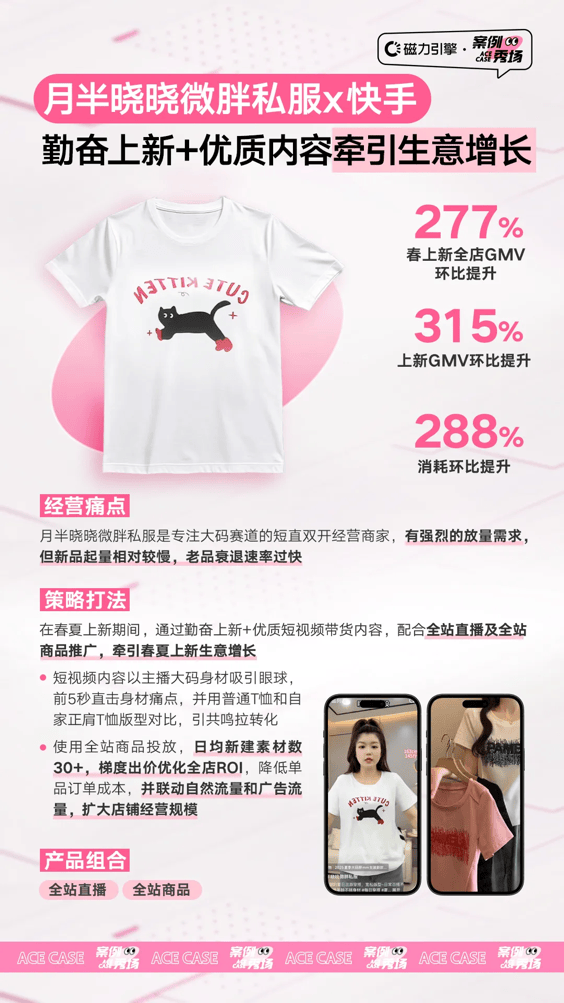 为了解决这个问题,月半晓晓微胖私服使用全站推广,以全站直播拓展场域,承接趋势品类流量,并以全站商品投放配合梯度出价优化全店ROI,扩大经营规模。同时其短视频内容直击用户痛点,并通过版型对比引共鸣、拉转化。最终,月半晓晓微胖私服全店GMV环比提升277%,上新GMV环比提升315%,消耗环比提升288%,实现了春夏换季新增长。