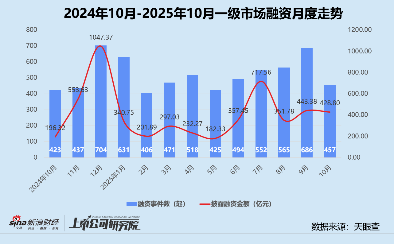 受“十一”假期影响,募资端和投资端热度均有所回落,但与2024年同期相比仍显示出显著修复。基于公开数据不完全统计,10月国内一级股权投资市场共发生457起融资事件,同比小幅增长8.0%,环比下降33.4%;披露总融资额约428.80亿元,同比增长118.4%,环比下降3.3%;平均单笔融资额同、环比分别提升102.2%、45.2%至9382.92万元,创下年内第二高。