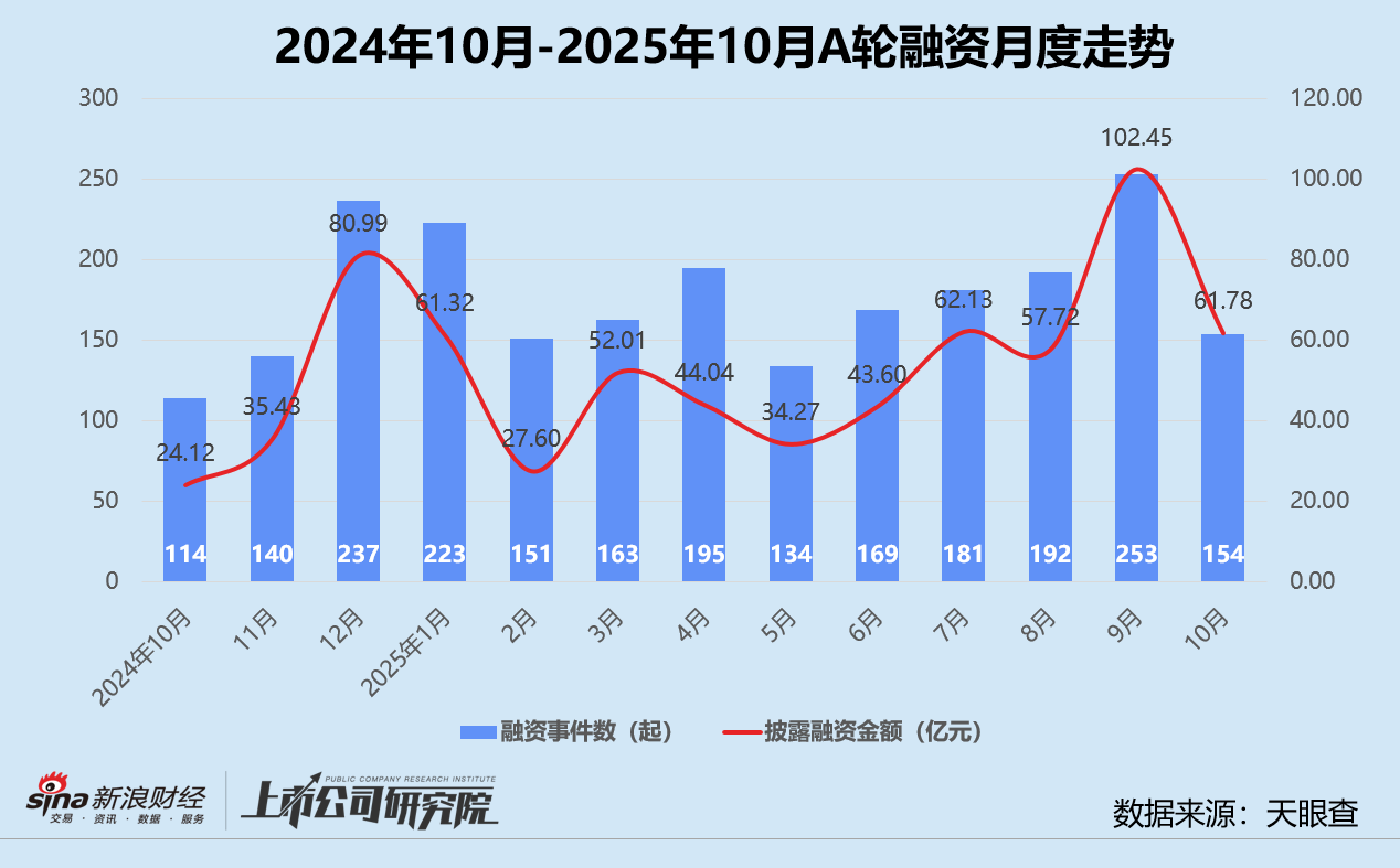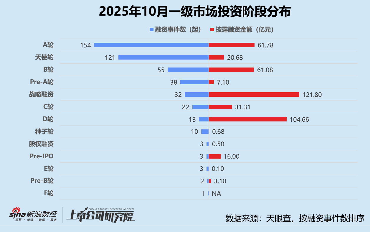 从融资阶段分布来看,早期阶段的种子轮、天使轮、Pre-A轮和A轮融资事件共有323起,约占融资事件数的70.7%,略高于2025年9月的69.2%,较2024年10月提高超6个百分点。其中,A轮融资事件数继续稳居榜首,约占融资事件数的33.7%,该指标环比虽小幅下降3.2%,但同比增长6.7%。