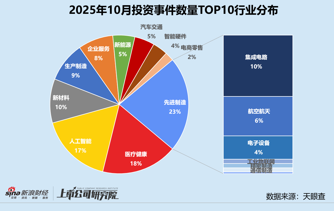 从融资行业分布来看,先进制造依旧凭借95起融资事件领跑,获投企业中约44.2%为集成电路公司,而2025年9月和2024年10月同指标分别为48.9%、50.0%。人工智能行业融资事件数连续第15个月跻身前三,本月共有72个相关企业获得融资,同比增长30.9%。