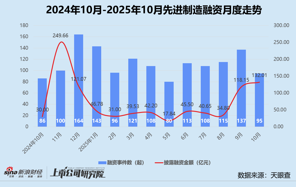 结合往期数据分析,除了2024年11月波动较大,先进制造行业步入2025年后融资表现整体平稳,并在9月迎来小高峰。本月融资事件数同比增长10.5%,环比下降30.7%;披露融资额较2024年10月翻了4倍有余,在9月高位基础上再增长11.7%。综合作用下,单笔平均融资额攀升至1.39亿元,再创年内新高。
