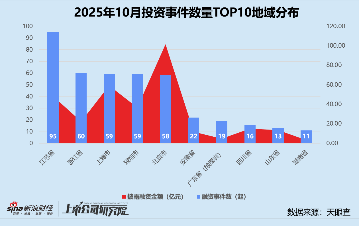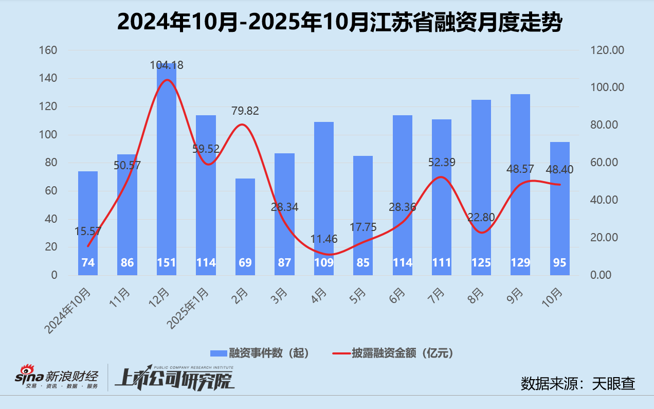 结合往期数据分析,江苏的融资事件数和融资金额较2024年同期分别增长28.4%、210.9%,与2025年9月相比分别下降26.4%、0.3%。其单笔融资额同比、环比分别提高142.1%、35.3%至5094.78万元,仅略低于年初表现。