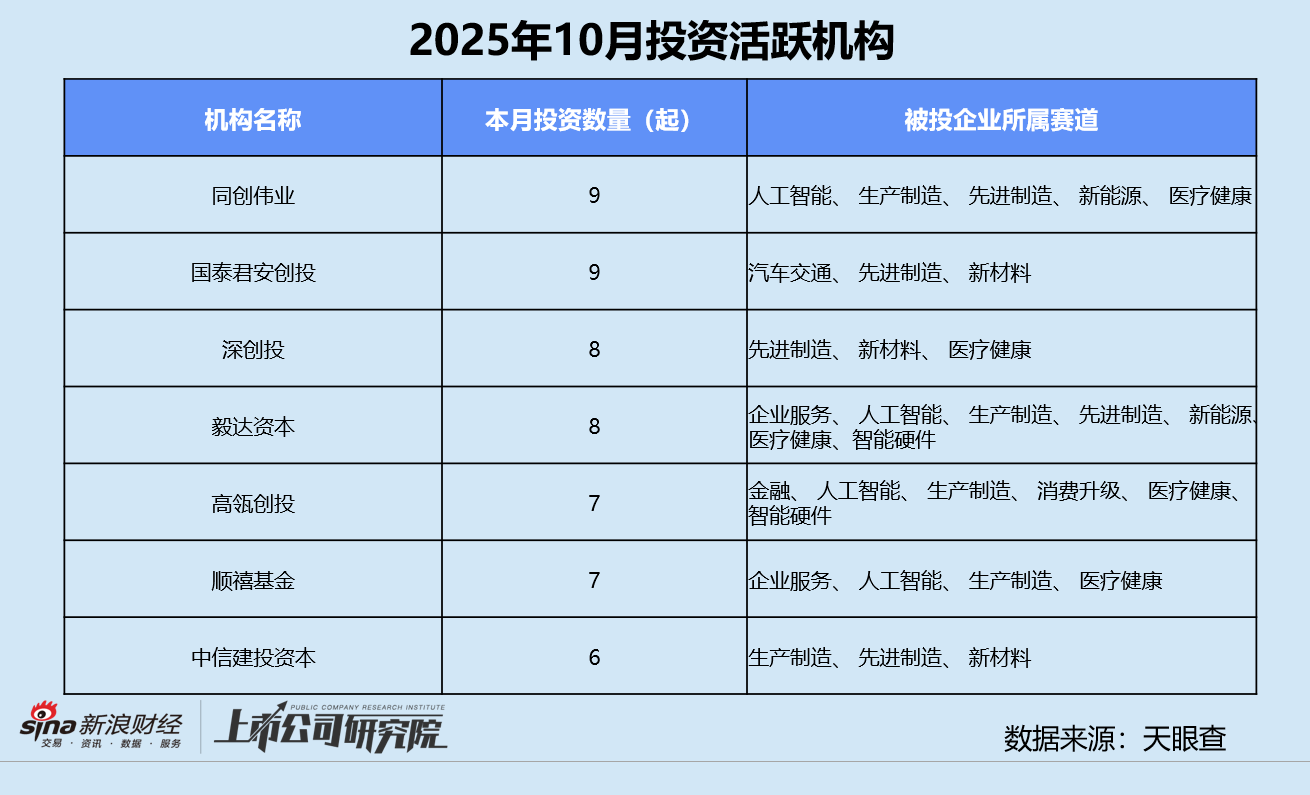 本月投资最活跃的机构包括同创伟业、国泰君安创投、深创投、毅达资本、高瓴创投等。投资事件数在6起及以上的机构中,国资背景机构约占71.4%。