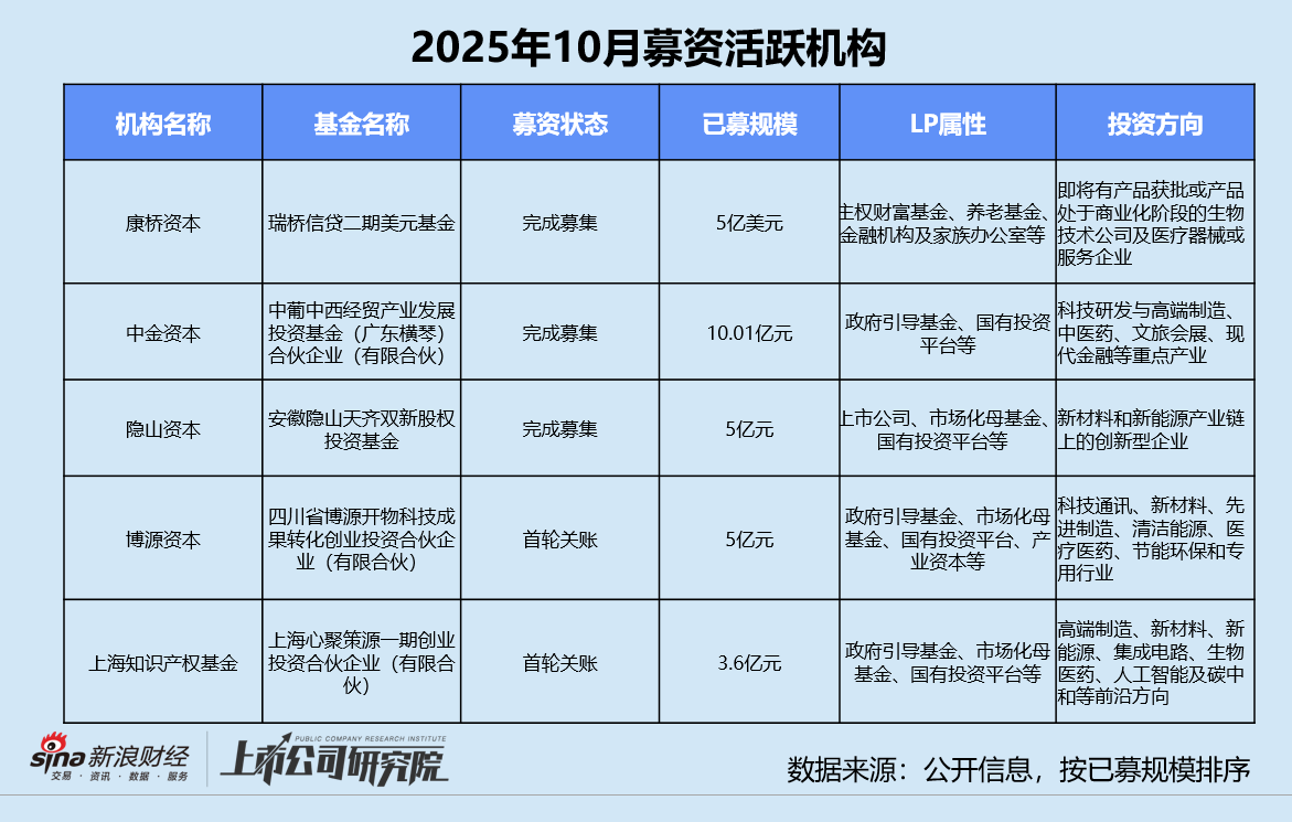 本月募资最活跃的机构包括康桥资本、中金资本、隐山资本、博源资本和上海知识产权基金。