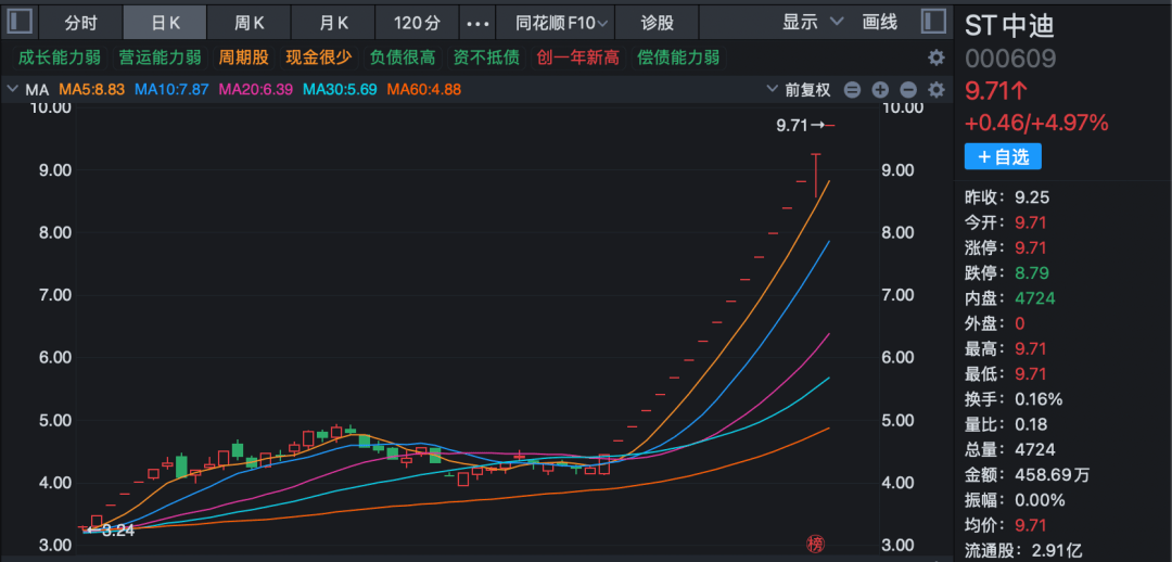 ST中迪(000609)涨停。走出17连板。11月3日,ST中迪方面对股价异动向投资者作出提示,表示若截至今年年底,公司年度营业收入无法达到3亿元,或公司净资产无法转为正值,公司股票存在被实施退市风险警示的风险。市场分析,此次ST中迪连续涨停或许与控制权将易主有关。