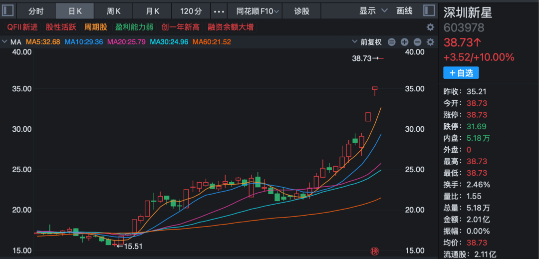有色板块走强,国城矿业(000688)、深圳新星涨停,斯瑞新材、华钰矿业(601020)、江南新材、湖南黄金(002155)等涨幅居前。
