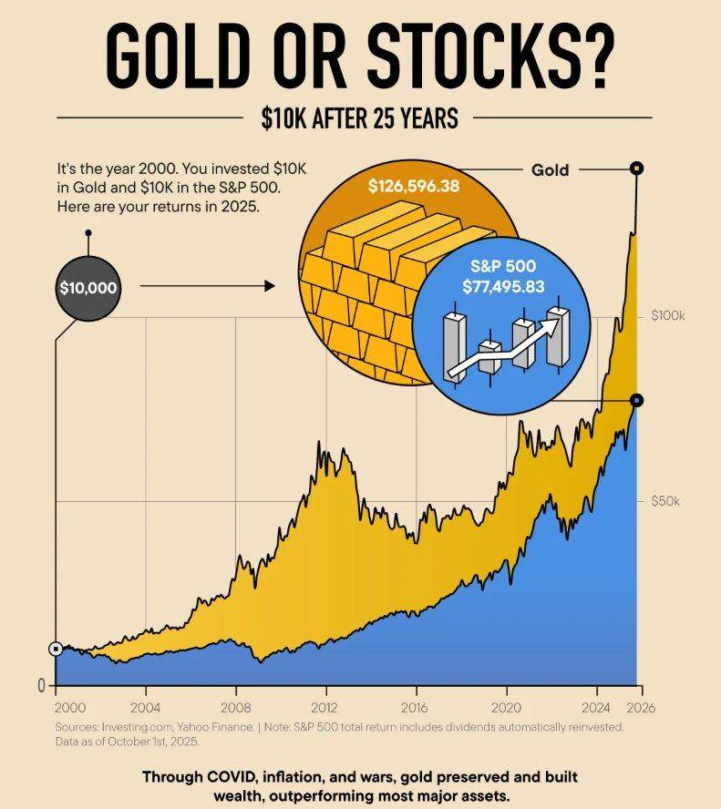 股票在2001-2002年、2008-2009年和2022年经历了大幅下跌,即使有股息,也减缓了其复合增长率。与此同时,通货膨胀加剧、货币波动以及各国央行和其他公共机构的持续购买推动了黄金价格上涨,并在2024-2025年间持续刷新历史新高。