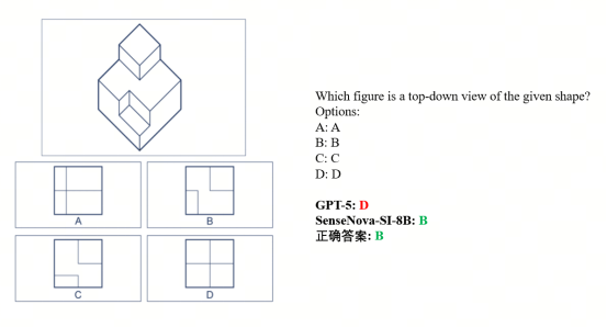 ?给出的立方体组合图形,要求选择正确俯视图。GPT-5选择答案D,SenseNova-SI-8B选择答案B,正确答案为B。(例题源自SITE-Bench)
