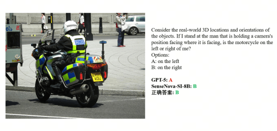 假设我站在手持相机人的位置,并且面朝他现在面朝的方向。摩托车是位于我的左侧还是右侧? GPT-5选择答案A(左侧),SenseNova-SI-8B选择答案B,??正确答案为B(右侧)。(例题源自SITE-Bench)