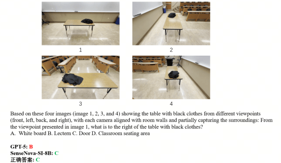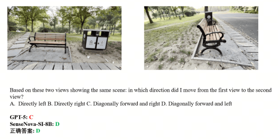 以下为GPT-5和SenseNova-SI-8B模型面对空间智能问题,给出的答案对比。