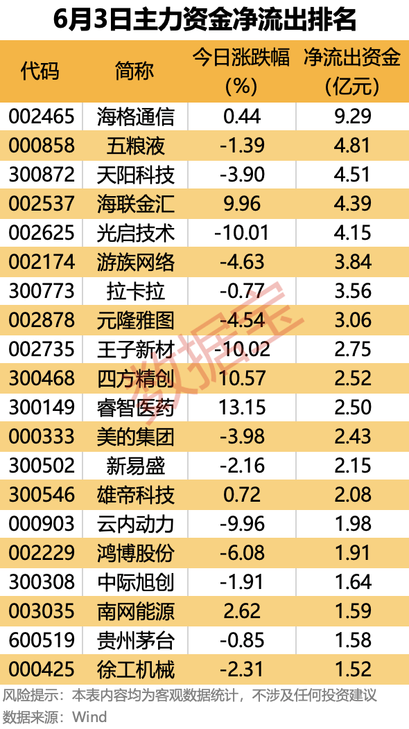 海格通信主力资金净流出居首,金额为9.29亿元;五粮液(000858)主力资金净流出4.81亿元,居次席。