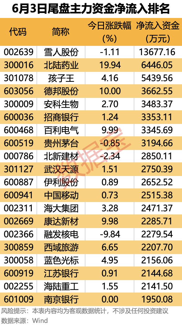 雪人股份尾盘主力资金净流入金额居首,达1.37亿元。北陆药业(300016)、孩子王、德邦股份尾盘主力资金净流入金额居前,均超3000万元,其中北陆药业涨停。