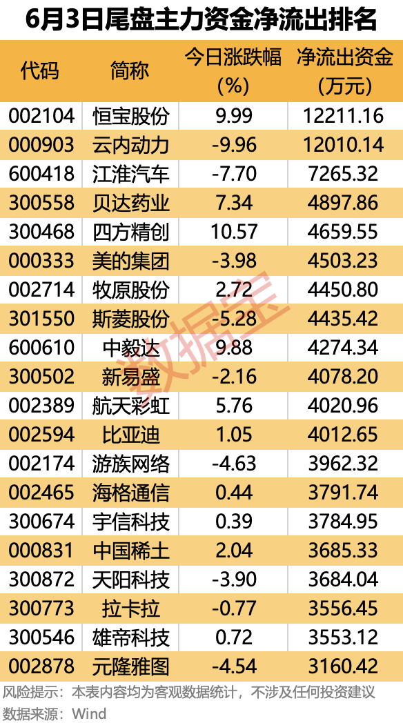 2股尾盘净流出金额均超亿元,分别为恒宝股份(002104)、云内动力(000903),前者股价涨停,后者股价跌停。