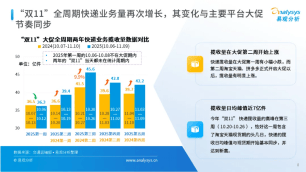易观分析根据交通运输部数据发现,在覆盖了主要电商平台双11周期的10月13日到11月9日的周期内,每周全国快递业务揽收量均实现比去年同周期增长,高峰出现在10月20日至26日,揽收量日均峰值近7亿件。这一时间与淘宝天猫双11现货期的头几日重叠,显示出双11对于消费者的巨大号召力。