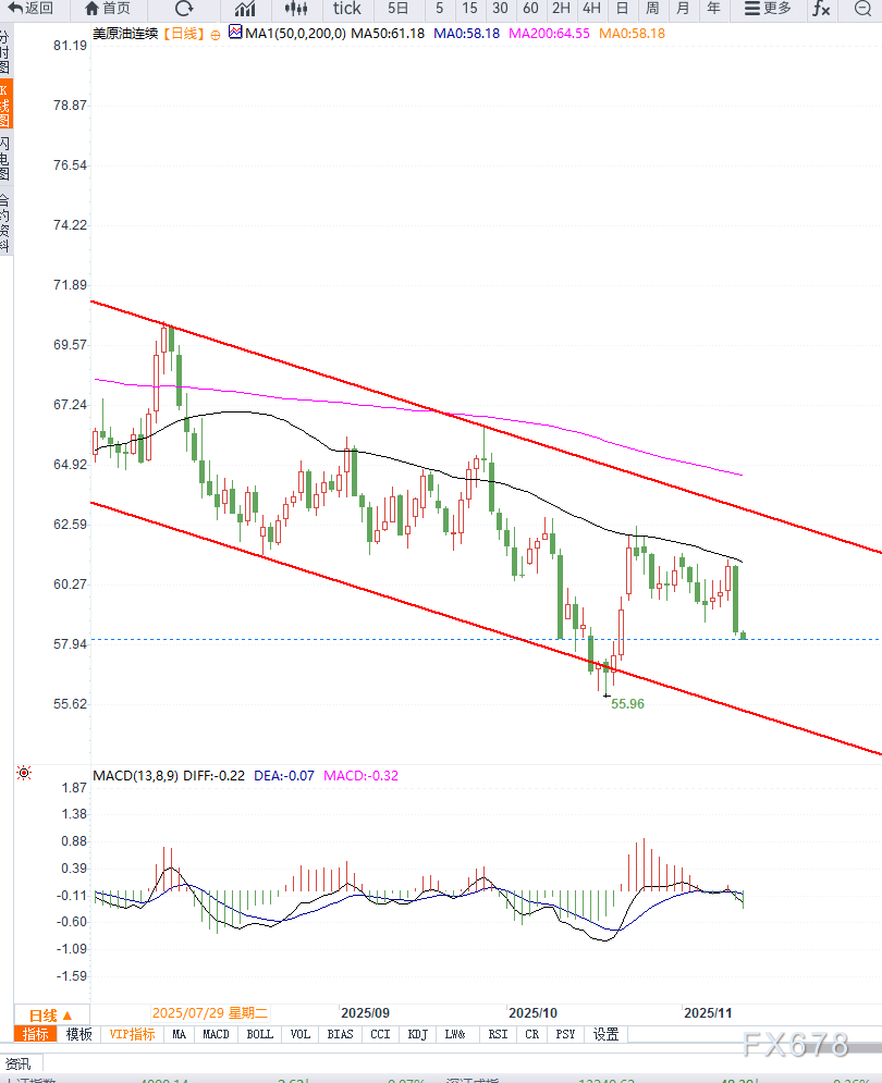 从日线图形来看,WTI价格目前位于58美元的关键支撑位附近。若该价位被有效跌破,下一目标支撑区间可能下探至56美元至55.50美元之间。技术指标方面,9日指数移动平均线(EMA)已下穿20日EMA,显示短期趋势偏弱;
