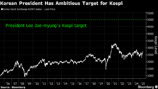李在明在竞选活动中曾表示,他对Kospi指数的目标为5,000点,但未明确时间表。这一目标凸显出他对股市的重视,他还承诺提升本地股票的估值,终结“韩国折价”现象。
