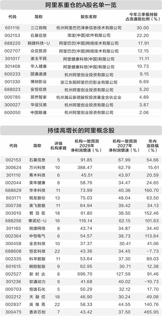 相比2024年三季报,阿里系已经退出光线传媒(300251)等个股前十大股东名单,且减持了居然智家等个股。在业内人士看来,这背后是阿里对电商、AI两大赛道的战略聚焦。对于能为这两大核心战略提供赋能的参股企业,阿里大概率会持续倾斜资源,这些公司也将在阿里未来的发展进程中获得实质性利好。