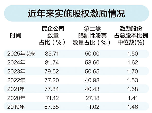 第二,民营上市公司股权激励积极性显著提升。数据显示,在实施股权激励的公司中,民营企业连续5年占比超过七成,而2024年更是突破81%,创下19年来新高,今年以来占比更是超过85%。
