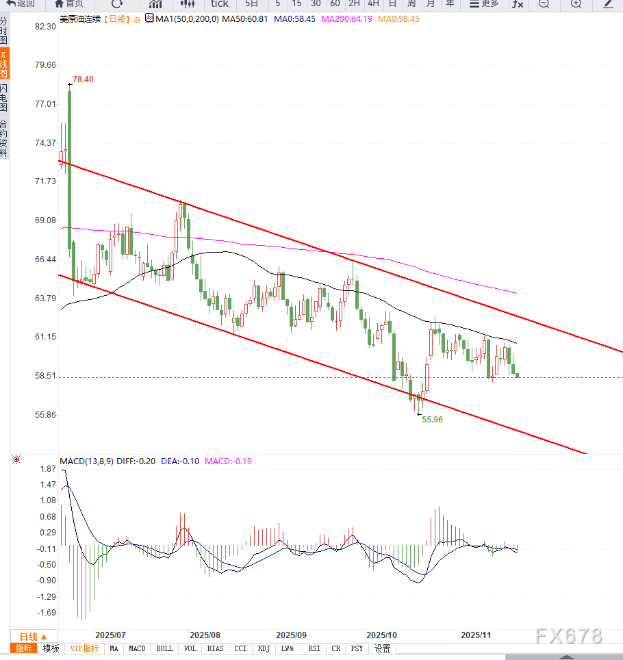 据市场调查显示指出,美方针对俄罗斯两家大型能源公司的制裁措施即将生效,这使得全球供应链在短期出现一定紧张情绪。然而,从过去经验判断,俄罗斯曾多次通过所谓“灰色运输渠道”实现出口,使得其能源收入尽管承压,但始终未出现断崖式下降。“尽管乌克兰表现出愿意探讨结束冲突的态度,但真正的不确定性在于俄罗斯是否真的有意结束局势僵持。”――某国际安全研究专家Rachel Ziemba市场交易层面则更为谨慎。随着制裁临近,部分原油贸易路线已出现重新调整,尤其影响了印度方向的进口结构,大型能源企业也被迫加快资产重整与转手进程。然而,投资者对这些制裁的反应仍然偏向低敏感度,更多将其视为短期扰动而非结构性因素。“市场普遍预期俄罗斯的燃料供应仍会通过隐蔽渠道进入国际市场,因此对制裁的价格反应并不强烈。”――Rachel Ziemba从需求端看,全球经济对能源需求的恢复节奏不均衡,而亚洲国家与其他新兴市场的需求波动进一步削弱了原油价格的上行动能。在供需两端均偏弱的背景下,任何与和平进展相关的增供预期都会被市场放大,从而压制价格反弹。从日线级别观察,美原油价格近期持续在58至60美元附近形成弱势整理区间,K线结构呈现典型的震荡下移形态。短周期均线向下压制,价格多次在上方的9日均线附近受阻,显示短线反弹力度有限。与此同时,14日RSI指标保持在中性偏弱区域,反映买盘动能不足,趋势性力量仍未形成有效反转。若后续价格跌破近期重要支撑位约58.00美元,可能触发进一步的下探空间;反之,若意外突破60.8―61美元上方压力区,才有机会扭转当前偏空结构。