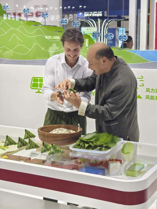 端午佳节已过,粽香依旧飘进了碳博会。在上海实业(集团)有限公司展位上,五芳斋展示了“真空烧煮灭菌二合一技术”等应用于生产流程的绿色新技术。据介绍,五芳斋通过数智化集成将裹粽桶手工模式升级为自动下米灌装线操作模式,成功提升裹粽效率30%;产品包装采用新型“竹浆+甘蔗渣”环保材料,追求绿色天然,减少包装废弃物,实现自然降解。