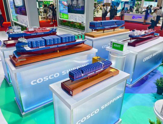 在中国远洋海运集团的展台,“绿色船队”吸引了多人驻足,其中包括中远海控(601919)订造的12艘24000TEU甲醇双燃料概念模型、中远海运集团自主研发建造的全球首艘江海直达纯电动力集装箱船、5月11日在上海港完成首次甲醇燃料加注工作的“中远海运洋浦轮”等。