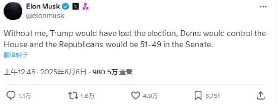 “没有我,特朗普会输掉选举,民主党会控制众议院,共和党会在参议院以51比49的比例获胜,”他发帖说。