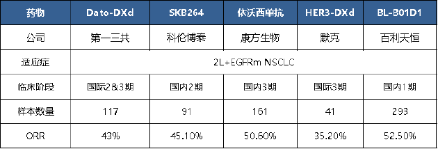 对比此前公布的小样本Ⅱ期EGFRm NSCLC数据来看,在更大样本量下ORR和mPFS数字有所下降,但非头对头数据比较显示芦康沙妥珠单抗在EGFRm NSCLC疗效数据仍优于第一三共的Dato-DXd(43%)以及默克的HER3-DXd(35.2%)。需要关注的是,国产竞品数据表现同样亮眼,康方生物的依沃西单抗联合化疗在对应适应症的ORR达50.6%,百利天恒的BL-B01D1在对应适应症的临床Ⅰ期试验中的ORR达52.5%。