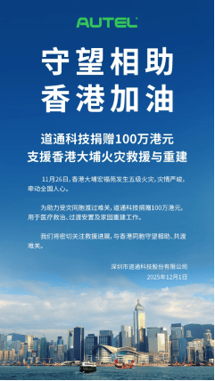 近日,香港大埔发生的火灾事故牵动人心。深圳市道通科技股份有限公司(688208)12月1日宣布,向香港特区政府“大埔宏福苑援助基金”捐赠100万港元,专项用于支持受灾地区的医疗救治、过渡安置及家园重建工作。