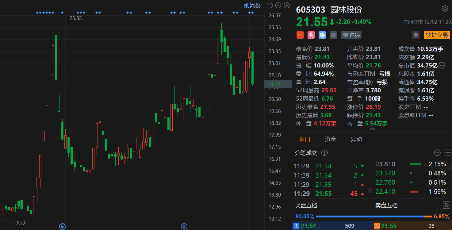 园林股份(605303.SH)大幅下跌触及跌停,午间收报21.55元,总市值34.75亿元。