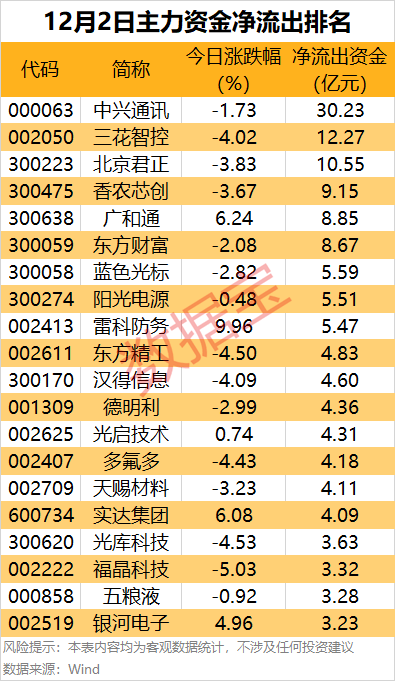 据数据宝统计,超110股主力资金净流出均超1亿元,其中25股净流出金额均超3亿元。