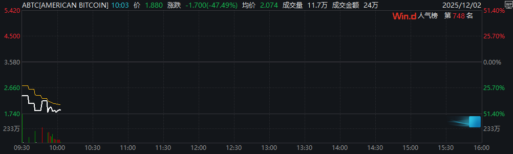 值得注意的是,被视为“特朗普概念股”的比特币矿商American Bitcoin大幅下跌,一度跌超50%,并因为股价波动过大,多次触发临时停牌。