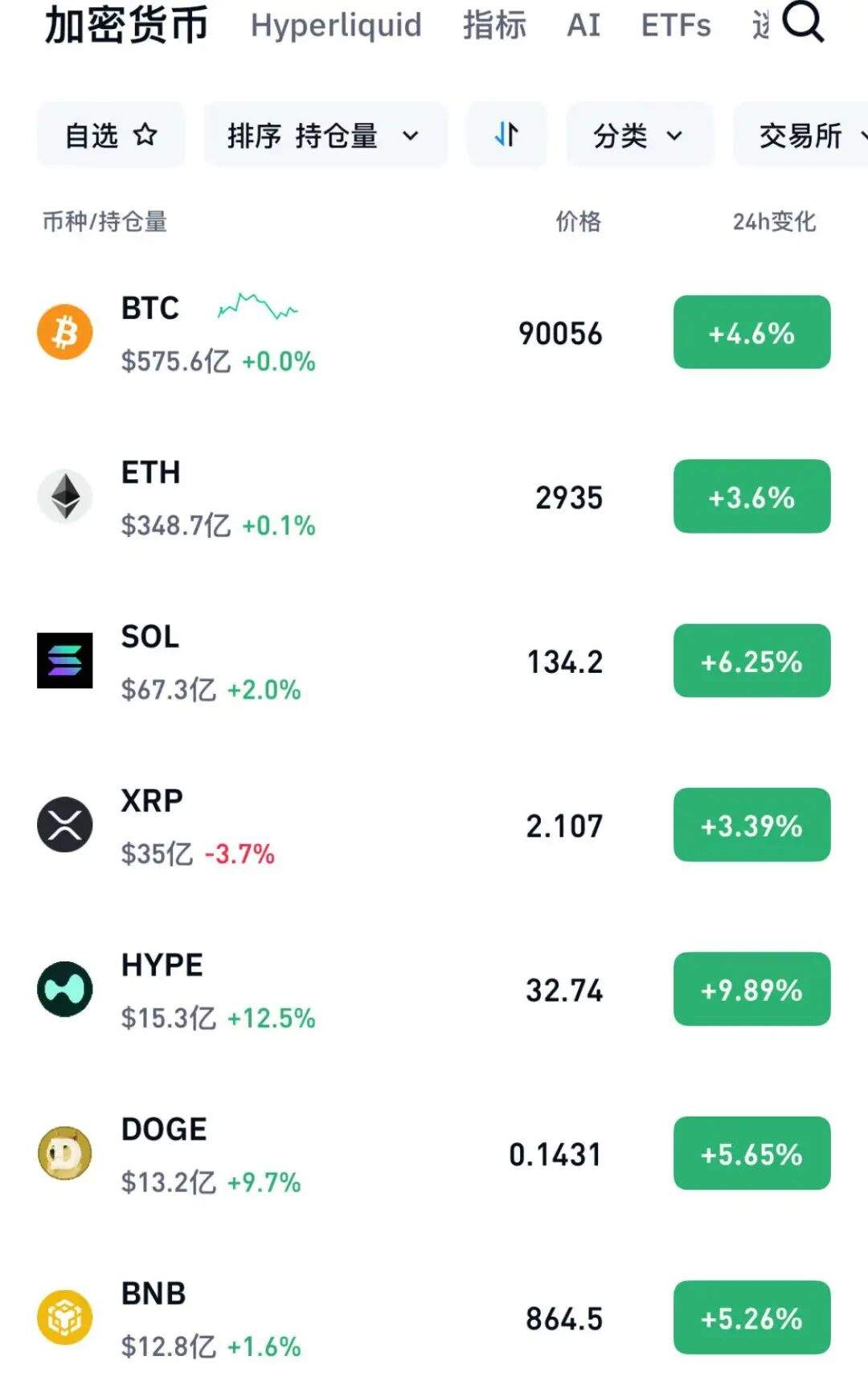 加密货币市场方面,CoinGlass数据显示,加密货币市场全线反弹,截至发稿,比特币站上90000美元 ,24小时涨幅超过4%,以太坊、XRP涨超3%,狗狗币、BNB涨超5%,SOL涨超6%。