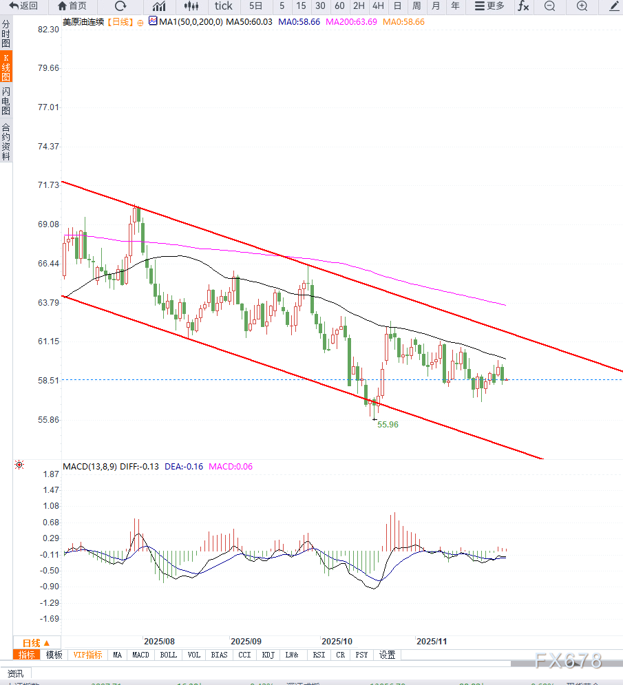 尽管如此,来自俄罗斯的地缘政治声音并未完全缓和。俄方表态称,如若遭到攻击,俄罗斯将准备应对来自欧洲的挑战,使得局势的不确定性依旧高企。最新美国库存数据根据最近一次公布的数据:美国商业原油库存在当周意外增加了248万桶。这明显与早前市场多预期库存将下降形成反差。库存增加通常被视为需求疲软或供应过剩的信号,对油价构成压力。因此,即使部分分析师仍预计库存可能下降,这一实际变动已部分削弱对原油价格的支撑。从WTI日线图走势来看,油价在跌破60美元关口后已明显跌穿短期均线支撑区,并触及近一个月震荡平台的下缘位置。近期连续阴线显示空头力量主导行情,MACD动能柱持续扩大在零轴下方,反映趋势延续弱势。只要价格维持在60美元下方,未来进一步下探前期低位的风险依旧存在;但若地缘局势出现新的扰动,不排除短线出现技术性反抽。目前,整体结构呈弱势震荡格局。