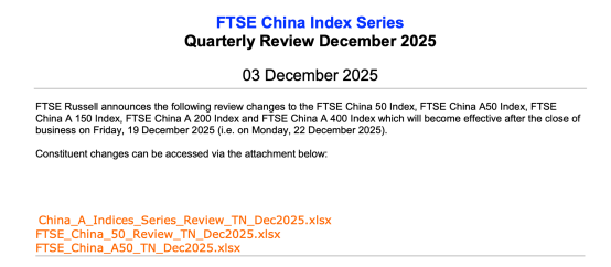 12月3日,富时罗素宣布对富时中国50指数、富时中国A50指数、富时中国A150指数、富时中国A200指数、富时中国A400指数的审核变更。该变更将于2025年12月19日星期五收盘后生效。