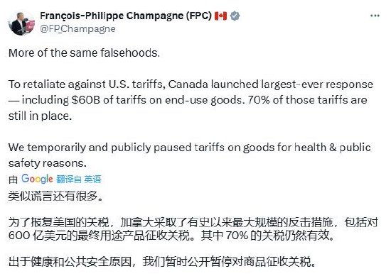 根据周六的一条社交媒体帖子,加拿大财长Francois-Philippe Champagne称,加拿大3月实施的反制关税中,70%仍在执行。他说,出于健康和公共安全原因,政府“暂时且公开地暂停”了对某些商品的关税。